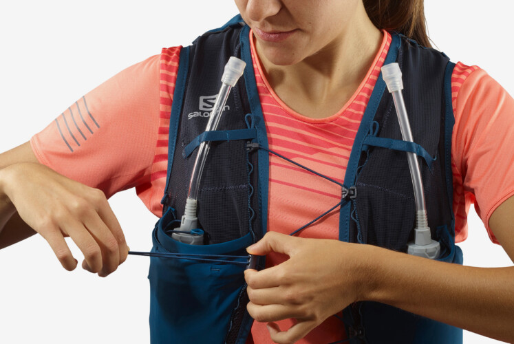 Die Weste schmiegt sich weich und elastisch wie ein eng sitzendes Kleidungsstück an den Körper. Sie ist luftdurchlässig und auch bei warmen Temperaturen gut zu tragen. Schon nach kurzer Zeit vergisst man, mit Gepäck unterwegs zu sein. Die Rückseite besteht aus einem vertikalen Einschubfach für eine Trinkblase und einem geräumigen Staufach, das sich komplett über den seitlich verlaufenden Reisverschluss öffnen lässt. In dieses ist ein kleines Einschubfach eingearbeitet, das zudem über einen Karabiner zur Befestigung bspw. eines Schlüssels verfügt. Die beiden mitgelieferten Flasks finden Platz in den Einschubfächern der Vorderseite. Ein etwas erhöht verlaufender Gummizug dient der Fixierung der längeren Salomon Soft Flask Speed Straws. Auf beiden Seiten sind auf der Außenseite der Flaskeinschübe Taschen für Gels und Riegel aufgebracht. Die linke Seite verfügt zusätzlich über ein kleines Reisverschlussfach für Wertsachen. Sehr nützlich ist zudem die bei Trailveranstaltungen obligatorische Pfeife für Notfälle. Die Schnürung lässt sich einfach in der Länge verstellen und an zwei Positionen ohne zusätzliche Klicks einhaken.