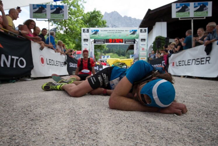Zurück zum Wettkampf: Der Downhill ist nun in vollem Gange. Über zahlreiche verblockte Steilstücke nähere ich mich der Letzten VP nochmals an der Talstation Längenfelder. Nochmals zügig Iso auffüllen und weiter die Serpentinen hinunter. Das Überholen geht mit der Zeit echt an die Substanz. Mein Rückstand auf Markus ist bestimmt wieder deutlich angewachsen. Jetzt kommt auch wieder die Übelkeit zurück. Das Gepoltere der langen Abstiege ist mein Magen echt nicht gewohnt. Ich gehe auf Nummer sicher, bloß nichts mehr riskieren auf dem Weg zu Platz zwei. Nochmals empfangen mich die ASICS-Leute. Diesmal steht da auch noch Matthias Schwarze. Wahnsinn, dass so viele hier einfach zum supporten kommen. Im unteren bewaldeten Gebiet ist es sehr schlammig und rutschig. Endlich erreiche ich den Ausgang der Klamm und das Hotel Hamersbacher Hof. Nur noch zwei schlappe km Asphalt liegen zwischen mir und dem Musikpaviliong. Ich versuche zu beschleunigen, doch mein Magen dreht sich in alle Richtungen. Das Tempo, dass ich mir hier vorgestellt habe, kann ich auf keinen Fall gehen. Schlepp, schlepp… Da, der letzte km! Plötzlich kommt von hinten etwas Rotes an mir vorbei. Dautel! NEIN! Das war´s dann mit meinem zweiten Platz! Ich lasse ihn direkt ziehen. Zehn Meter, dann zwanzig Meter hat er Vorsprung. Nix gibt´s! So leicht gebe ich mich nicht geschlagen! Ich erhöhe das Tempo und robbe mich wieder heran. Ohne Rücksicht auf jeglichen Verkehr kreuzen wir die Hauptstraße in Grainau um den möglichst schnellsten Weg zu gehen. Doch Alex ist alles andere als langsam in solchen Abschnitten. Auf den allerletzten Metern muss ich dann doch resignieren. Verfluchte 17 Sekunden!!! Soviel bin ich am Viezetitel nach 9h 16min und 54sec vorbeigelaufen. Macht nix! Nach einer Emotionalen Umarmung mit Alex sinke ich zu Boden. Keinen Meter mehr weiter geht es. Ich kann meine Augen kaum aufhalten und brauche über eine Stunde um wieder ansatzweise zu mir zu kommen. Es war aufgrund vieler Umstände nicht mein allerbestes Rennen, aber sehr wohl mein härtestes. Soviel steht fest!!!