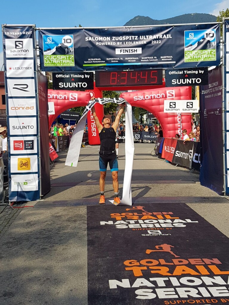 Siegerehrung Deutsche Meisterschaft beim Zugspitz Ultratrail 2022 mit den Deutschen Meistern Anna Hahner und Markus Mingo © xc-run.de