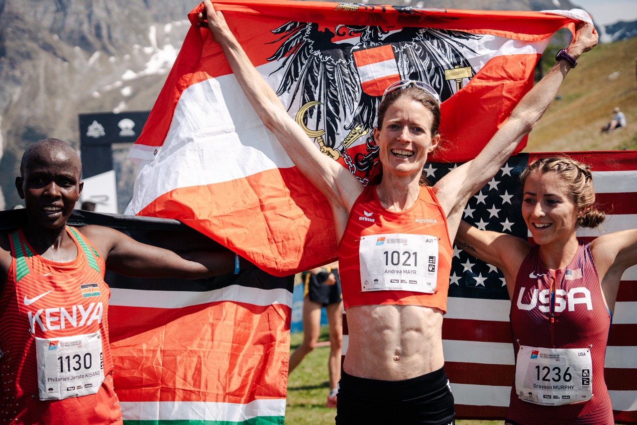 Rekord-Weltmeisterin Andrea Mayr aus Österreich hat sich bei der Heim-WM in Innsbruck-Stubai im Vertical zum siebten Mal die Goldmedaille geholt und dem Gastgeberland im zweiten Rennen die erste Medaille beschert. Mayr setzte sich gegen Philaries Jeruto Kisang aus Kenia und Grayson Murphy aus den USA durch.