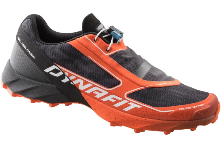 DYNAFIT präsentiert mit dem Feline Up Pro seine jüngste Innovation für sportlich ambitionierte Trailrunner. Der Schuh ist mit 240g (42) sehr leicht und mit dem „Narrow Minimal Fit“ sitzt der Wettkampfschuh eng und präzise wie ein Handschuh. Besonderes Augenmerk haben die Schuhentwickler bei DYNAFIT auf die Sohle gelegt, bei der erstmals die neue Vibram® Lite Base Technology zum Einsatz kommt. Dank der innovativen, leistungsfähigen Außensohlen-Konstruktion konnte die Dicke des Materials deutlich reduziert werden, wodurch sich rund 25 Prozent des Gewichts einsparen lassen ohne an Funktionalität oder Schutz einzubüßen. Abgerundet wird der Alpine Running Schuh durch ein Ortholite® Fußbett sowie ein Schnellschnürsystem mit elastischer Lasche zum Verstauen der Schuhbänder, das wunderbar aufgeräumt wirkt und bestens funktioniert. Den Schuh sollte man unbedingt vor dem Kauf anprobieren, da er für manchen Fuß wohl etwas zu eng und schmal geschnitten ist, was trotz der guten Passform sehr schnell unangenehm werden kann. Als Schwachpunkt entpuppte sich die sehr harte Sohle im Vorfußbereich, die bei eingen Läufern zu Problemen am Fußballen führte.