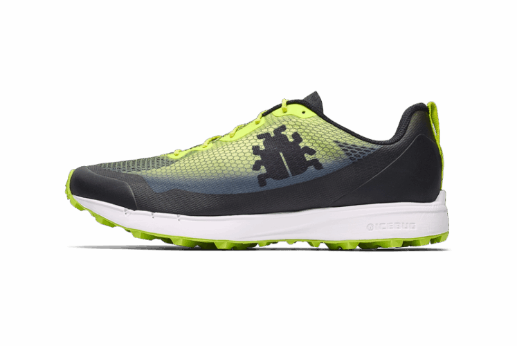 Auf den ersten Blick sieht der Oribi 4 von Icebug wie ein modischer, bequemer Freizeitschuh aus. Die lime farbene Sohle wird von der weißen Zwischensohle unterbrochen. Der Schuhaufbau besticht mit einem fließenden Übergang zwischen lime und schwarz. Die Schnürung ist klassisch mit gedrillten gelben Schnürsenkeln. Eine Besonderheit sind die mit leichten Kunststoffplättchen verstärkten Ösen. Mit einem Gewicht von nur 240 g ist der Oribi 4 sehr leicht. Diese Gewichtsersparnis ist vermutlich auch auf Kosten erhöhter Sicherheit gegangen, da die Sohle nur im vorderen Bereich leicht hochgezogen ist und dadurch nur einen geringen Schutz gegen grobe Steine und herumfliegende Äste bietet.