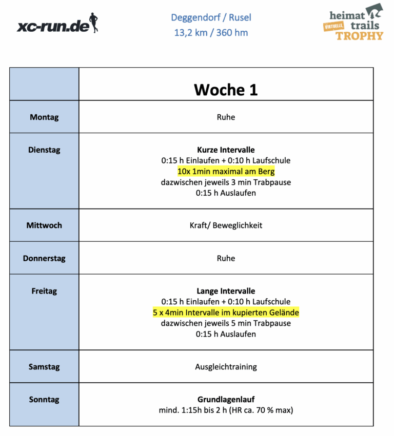 Der Fokus des (sehr kurzen Trainingsplanes) liegt natürlich an der Anpassung an die Gegebenheiten des Geländes. So stehen vor allem Bergsprints und Intervalle im Gelände auf dem Programm. Es wird bewusst mit Minutenangaben gearbeitet, so haben Anfänger und Fortgeschrittene dieselbe Belastungsdauer – der Profi kommt halt in derselben Zeit etwas weiter.
